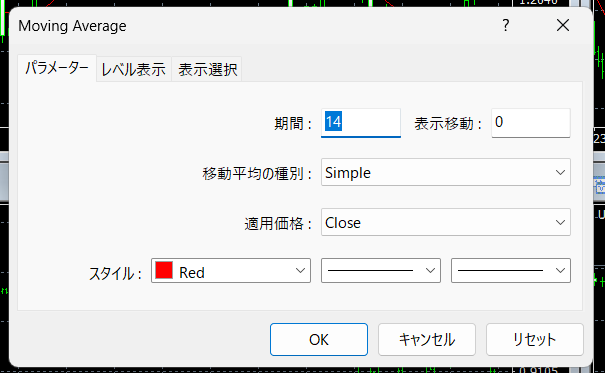 ▲ Moving Average(移動平均線)のパラメーター設定画面。期間・種別・色などを自由に設定できる。